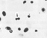 采用人血红细胞与台盼蓝,以及人血红细胞与3H标记的胸腺嘧啶核苷的混合液,分别进行处理。照射时间分别为20、40、60、80、100 min,照射后经处理,制成细胞涂片,显微观察。