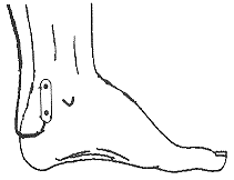 由于人体组织电磁特性的非线性与非均匀性,在不同部位的电刺激下有着不同的场的分布与效应。在体感诱发电位检测中,刺激电极一般放在内踝与根腱后缘之间的中点,如图1所示。由于所刺激的神经处于皮下较浅的位置,而且电极所处位置皮下组织较为简单,结构上相对可以认为是一个平面,我们采用平面分布的电磁场分析方法来模拟这个刺激过程。一般临床采用的电刺激频率为10 Hz以下,不同于交变电磁场中产生的场效应而更加接近静电场,可以认为是一个准静电场过程,在此我们应用静电场的分析方法建立模型。在以静电场看待这一电刺激过程时,人体内的离子流动特别是离子聚积问题是应该予以考虑的,但由于电刺激强度一般在恒压50~100V 或恒流10~40 mA,远远大于体内自身产生的电势场与电流场,建模过程中可以忽略人体内离子流动和离子聚集的影响。