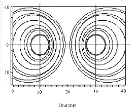 b. 电极放置位置处的纵截面的电流分布图(即y=0,x、y平面),x=10,z=0(和x=30,z=0)处,电流密度值为J0,向外依次是85%J0,70%J0,……的等值线。