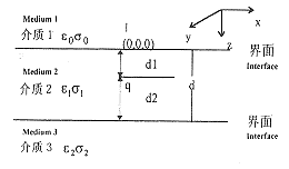 对于图1所示的刺激模型,我们假定它由三层组织组成:空气层、皮肤与皮下组织、胫后神经纤维组织,分别将其定义为介质1,介质2和介质3,如图2所示。为分析的方便,假设一点电荷位于介质2中距界面1上坐标原点(0,0,0)为d1的位置,待得到解析式后,令d1趋近于零即可得到与实际相似的模拟结果。