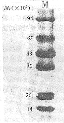 取10μl(含100μg)CM(含HC和LC)、10μl(含12μg)的CD-LC及10μl(含10μg)的标准蛋白,用不连续缓冲系统的SDSPAGE,鉴定CM-LC的纯度和Mr。