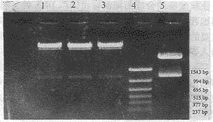 1,2,3:pWR450-1/TKclones①,②and③;4:DNAmarker;5:Positivecontrol(pUC18/TKplasmid)