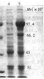2.3 HSV-1TK基因融合蛋白的表达 以IPTG诱导pWR450-1/TK/JM109,可表达Mr约为97000的融合蛋白。空载体pWR450-1/JM109表达Mr约为55000的蛋白,结果见图3。双波长薄层扫描分析显示,TK基因融合蛋白含量占菌体蛋白总量的27.47%。