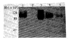 2.5 相关蛋白N35的酶解 GLC-82细胞裂解物用N-glycanase消化(37℃1h)后,再以抗N35mAb进行免疫印迹(图5)。第1泳道可见消化后的相关蛋白N35分解成Mr≈65×103,80×103及 86×1033个不同的小片段;第2泳道可见未经消化的相关蛋白N35(Mr≈75×103~130×103)。