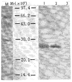 2.2 融合蛋白的表达 重组人IFN-α 2b分子由166个氨基酸残基组成,相对分子质量(Mr)为19000;HBV Pre S2分子由55个氨基酸残基组成,加上连接序列编码的4个氨基酸残基,融合基因编码的IFN-PreS2融合蛋白共含225个氨基酸残基,推测其Mr为25000~27000。SDS-PAGE分析表明,pBV-IFN-PreS2转化菌经温度诱导后,在Mr27000处有1条明显的表达带,其Mr的大小与推测的融合蛋白的Mr相一致。表达量占菌体总蛋白的15%。离心后收集的粗制包涵体中,目的蛋白的含量达到总蛋白的70%以上。SDS-PAGE的结果见图3,所用聚 丙烯酰胺凝胶的质量浓度为120g/L。