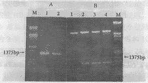 2.3阳性克隆插入DNA片段的鉴定分别提取克隆77#和79#的质粒,用EcoRI和SalI双酶切后,在琼脂糖电泳中可以看到除质粒片段外,还出现1条1.4kb的带(图3A)。与此同时,以克隆77#和79#的质粒为模板,利用上述引物进行PCR扩增,同样得到了1.4kb的条带(图3B)。
