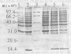 1.2.2原核表达与鉴定以pExSecI/hFKBP12转化宿主菌BL21(DE3)plysE,转化子过夜活化后,按3%接种于新鲜的LBkan培养基中,37℃培养至A600nm值约0.6。加入适当浓度的IPTG,在合适的条件下诱导,将发酵菌体经超声破碎、12000r/min离心后,用160g/LSDSPAGE分析重组蛋白hFKBP12的存在形式。