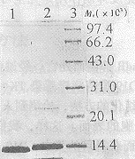 FKBP12是免疫抑制剂FK506结合蛋白(FK506bindingprotein,FKBP)家族的主要成员,因预计相对分子质量(Mr)为12000而得名,实际上其电泳行为Mr约14000。自1989年发现此蛋白以来,人们的研究主要集中于其介导的免疫抑制作用。1994年研究发现,FKBP12在神经系统中的含量比在免疫系统中要高出50倍以上,通过其介导FK506在体内外均可促进神经再生〔1〕。这一重大发现,使FKBP蛋白家族的研究成为热点,人们力求设计一类新型的FKBP结合药物,去除FK506的免疫抑制作用,而保留其促神经再生作用,以作为神经再生促进剂而应用于临床。1997年,美国一家药厂开发的基于FKBP12和FK506结构而设计的化合物已推进到猴的巴金森氏综合症模型上,使在这一领域的研究迈出了可喜的一步〔2〕。为了进一步研究FKBP12介导的促神经再生作用的机制,合理设计促神经再生剂,我们在大肠杆菌中表达了hFKBP12,并对表达产物进行了生物学活性研究。