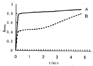 2.4PPIase的活性测定溶液中AAPF的ProAla肽键处于顺反式构象的动态平衡之中,hFKBP12是一种肽基脯氨基顺反异构酶,可协助AAPF顺反态之间的转变。当AAPF处于反式状态时,会被α胰凝乳蛋白酶裂解而释放,可在390nm波长检测的pnitroanilide基团。我们将纯化的hFKBP12,以7nmol/L浓度测定其PPIase活性。结果显示,复性后的hFKBP12具有较强的PPIase活性(图4),从而为以后的工作奠定了基础。