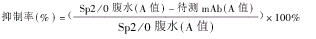 1.2.2mAb的特性鉴定(1)交叉反应试验:取腹水型mAb分别与HCV的NS3,NS4,NS5,C33肽,CP9和CP10进行间接ELISA。(2)阻断试验:采用竞争ELISA法。用抗HCV检测试剂盒中的抗原包被板条(包被抗原包括:NS3,NS4和核心蛋白等),在反应孔中加入抗NS3蛋白mAb,41℃作用40min后,依次加入抗HCVIgG阳性血清和HRP抗人IgG(加入试剂后的孵育温度和时间同前)。显色后,于450nm处测定光吸收(A)值。抑制率计算公式为: