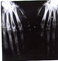 图2 幼年性透明蛋白纤维瘤病手部X线