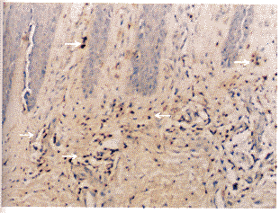 穿孔素的表达:穿孔素在正常人皮肤组织中表皮及真皮均为阴性表达。15例银屑病组织中有12例为穿孔素阳性表达(见图2),而在12例扁平苔藓中则有11例为阳性,阳性表达主要在浸润的淋巴细胞上,为胞浆染色。这两组疾病表皮中穿孔素均为阴性表达。
