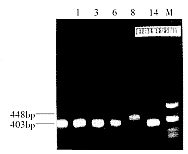 1.分群结果:①引物UMS125,UMA226PCR扩增Uu第1群4个血清型得到的片段长度为403bp,第2群8型扩增片段长448bp,结果见图1。②引物UMS51、UMA427PCR扩增Uu第1群1、3、6、14血清型得到的片段长度为429bp,结果见图2。