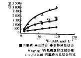 2.4 神经毒剂染毒对GABA受体结合曲线的影响:用99 μg.kg-1的梭曼皮下染 毒大鼠,大鼠抽搐发作时,发现实验组大鼠脑GABA受体的3H-CPM值在3H-GABA浓 度为40、80、100 nmol.L-1时比总结合值显 著降低(P<0.05)。用丙氟磷腹腔染毒大鼠,GABA受体的结合值显著降低(P<0.05 或P<0.01,见图2~4)。