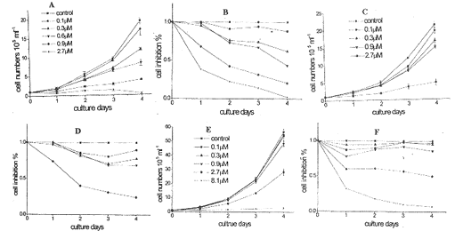 1.2.2 As2O3对细胞增生的影响:将 三种细胞以1×105细胞/ml接种,分别加 入0.1~8.1 μM As2O3,每隔24 h收集106个不同浓度作用后的三种细胞,用0.4%的 台盼蓝染色计数,三组取平均值。细胞抑制率=(对照组活细胞数-药物处理组活细胞数)/ 对照组活细胞数。