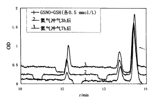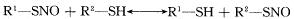 纯R—SNO是化学性质较稳定的一类化合物,在生物体系中,众多的蛋白质、酶类、小分子多肽和巯基类化合物等均含有多量还原性巯基,这些R2—SH都可与R1—SNO发生—H基团和—NO基团的交换从而生成一新的R2—SNO和另一新的R1—SH,其反应过程如下反应方程式所示: