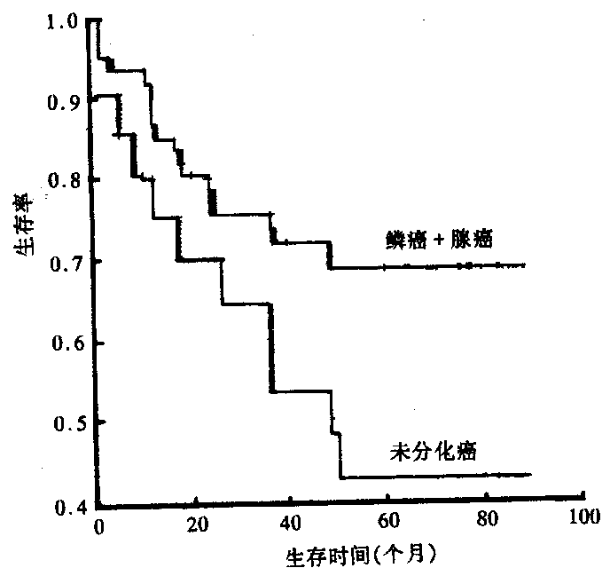 全部病例随访至5年,末次随访时间1996年3月, 2例失随,随访率为97.6%。 全部病例5年生存率为62.2%,综合组为76.0%,单放组为38.3%; 未分化癌为42.9%,鳞癌+腺癌为68.0%。单因素分组分析单放组的生存率明显低于综合组,未分化癌生存率明显低于鳞癌加腺癌(P<0.05)。 综合组与单放组、未分化癌与鳞癌+腺癌生存率曲线分别见图1及图2。