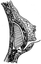 如行乳房假体置换,则在分离至腺体内下方的边缘后,分离并显露乳房假体包膜,剪开包膜,将假体完整取出。如假体位于胸大肌浅面,可只切除增厚的部分包膜,并按胸大肌纤维走向切开假体底部的包膜,即可见到胸大肌,重新于胸大肌深面分离腔穴。如假体位于胸大肌深面,可将包膜于反折处切开、松解,并部分或全部切除增厚的包膜,进一步扩大腔穴,主要是分离内下方的胸大肌起点处的肌纤维,以便扩大腔穴的内下方。