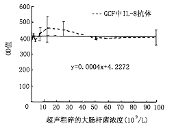2.间接ELISA法检测结果:在各GCF混合样本中加入不同浓度的大肠杆菌粉碎液后,检出的IL-8自身抗体OD值的标准差均非常小(0.003),IL-8自身抗体的平均检出OD值(0.042)高于阴性对照值标准差的3倍(0.034),证实GCF中有IL-8自身抗体。附图显示细菌超声粉碎液各浓度梯度与其相应IL-8抗体检出OD值的拟合曲线为一斜率近似零的直线(Y=0.000 4X + 4.227 2),说明大肠杆菌超声粉碎抗原对IL-8抗体的检出无明显影响。
