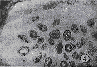从Ⅰ—Ⅳ组AgNOR计数均值呈递增趋势,差异显著(P<0.05)。正常和单纯增生上皮内AgNOR颗粒大多为单一型,在中、重度异常增生组大多为聚集型,鳞癌病损中AgNOR弥散型,聚集型均可见到,偶见核仁内型(图1~3)。