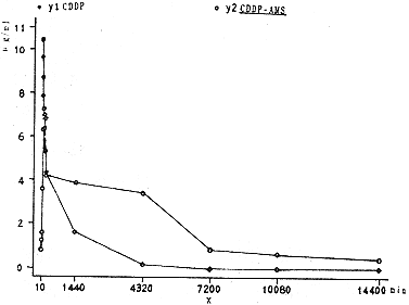 从图、表中可知,单纯顺铂灌注后外周静脉血药浓度达峰时tp极短,仅10min,峰值(cmax)为10.42μg/ml,达到峰值后迅速下降,血药消除半衰期t1/2,为2.5750hr,血药消除速率常数(ke)为0.2692,血药平均滞留时间(MRT)为16.6817hr,灌注后三天外周血中基本上已无法测出CDDP浓度。而CDDP—AMS灌注组外周血药浓度上升和下降均较缓慢,达峰时tp90min,峰值Cmax为6.35μg/ml,是CDDP组的60.94%,血药消除半衰期t1/2为96.3653hr,是CDDP组的37.42倍,血药消除速率常数(ke)为0.0072,平均滞留时间MRT为117.7162hr,是CDDP组的7.06倍。利用等离子光谱仪,灌注后10天仍能在外周血中测到一定水平的铂。因此,CDDP—AMS灌注后,CDDP在血中的消除较缓慢,滞留时间较长,能充分被靶组织所利用,可见它具有缓释作用。