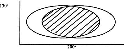 双眼有各自的视场。当双眼均睁开时,右眼的视场与左眼的视场相重叠,重叠的这部分称为“双眼视场 ”,该区域的感觉同时进入右眼和左眼,并同时在右眼和左眼成像,双眼视场区有最好的精细运动谐调,有很好的深度觉 (立体视)。双眼各自颞侧为单眼视场,其大小依鼻子的高低而定,见图1。