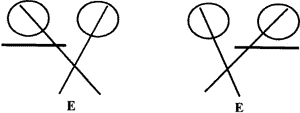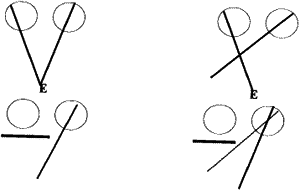 ①交叉遮盖试验:交叉遮盖试验可检查病人有否隐斜视及斜视的方向和大小,但不能鉴别是隐斜视还是斜视。在交叉遮盖时,将一眼遮盖破坏融像,被遮盖眼回到它原来隐斜或斜视的位置,未被遮盖眼注视着视标,被遮盖眼表现为:①仍然保持对视标注视的一致,称为正视位;②内偏位,称为内斜;③ 外偏位,称为外斜;④上偏位,称为上斜;⑤下偏位,称为下斜;也有可能同时在水平和垂直方向都偏位。在下图中,浓黑线表示遮盖,黑线表示黄斑视线,见图2~4。