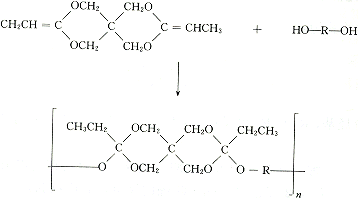 所用原酸酯主要有三甲基原乙酸酯,三乙基原乙酸酯。三元醇单体有直链的1,2,6-己三醇和环状的1,1,4-环己三甲醇等。例如三乙基原酸酯与三元醇聚合反应为: