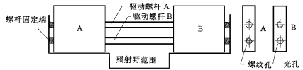 光栅叶片A、B在其侧面各钻两个孔,如图5(b)所示:一个为螺纹孔,一个为光孔。A、B的两孔位置相反,互相交错。驱动螺杆A与叶片B构成螺旋传动方式,通过叶片A的光孔固定在托架两端,光孔的直径稍大于螺纹孔;同理驱动螺杆B与叶片A构成螺旋驱动方式,通过叶片B的光孔与托架两端固定。两驱动螺杆分别由各自的步进电机驱动,这样通过控制步进电机的转速就可以控制叶片A、B的前进速度,通过控制步进电机的正反转,来控制叶片的前进后退。通过这种机械结构再加上计算机软件的控制,基本上可以实现强度调制型的适形治疗。