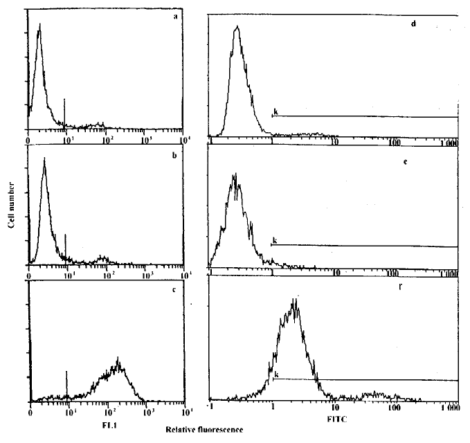Note:a.P815-IAd cells were staining of fluorescent conjugate without IAd mAb;b.P815 cells were staining of IAd mAb plus fluorescent conjugate;c.P815-IAd cells were staining of IAd mAb plus fluorescent conjugate;d.P815-IAk cells were staining of fluorescent conjugate without IAk mAb;e.P815 cells were staining of IAk mAb plus fluorescent conjugate;f.P815-IAk cells were staining of IAk plus fluorescent conjugate