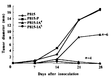 Note: 1)DBA/2 mice were injected with 1×105 cells and mice free of tumor at 4 w were challenged with 1×105 wild type P815 cells