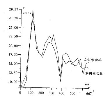 血流分析法:从扫描得出的30幅双侧椎动脉的截面的轮廓,选择与椎动脉的截面大小,形态 近一致的兴趣区(ROI),使ROI在30幅图像上始终与所测血管截面保持一致。流动分析 软件可自行计算出椎动脉的峰值流速(Peak Velocity)、平均流速(Mean Velocity)及流量 (Mean Flow)。在屏幕上显示反映椎动脉内血流速度和流量的变化曲线。经统计学处理分析 ,判断所有样本统计结果的标准误P定为0.05,小于0.05时被认为有意义。结果