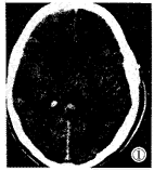 图1,2 平扫右颞顶叶见5cm×5cm×6cm圆形混杂密度影 ,周边轻度水肿;左额叶见1cm×1cm×1cm圆形稍高密度影,周边轻度水肿