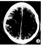 CT增强扫描:右颞顶叶病灶呈环状强化,环壁不均,左额叶病灶呈 均一强化,右侧侧脑室受压变扁,中线偏左(图3,4)。