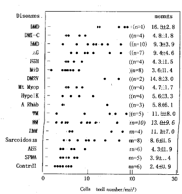 2.4 神经肌肉疾病活检肌组织中巨噬细胞Chymase免疫组织化学定量研究〔6〕 神经肌肉疾病是一组主要以肌肉组织进行性萎缩为主要病变特点的疾病,多由染色体异常所致,一直缺乏有效的治疗措施。1995~1997年间,我们与日本学者合作研究了40例不同类型的肌萎缩患者,观察了其活检肌肉样本组织内巨噬细胞表面标志-Chymase(胰凝乳蛋白酶样蛋白酶)的定位和定量。定量时用NIH图像分析系统测试计算出每平方毫米切片中含有Chymase阳性的细胞数目,测试结果见图6。