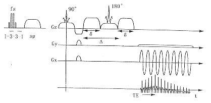 Gx: 频率编码;Gy: 相位编码;Gz: 层面选择;δ:梯度场持续时间;sp: 扰相梯度;fs: 脂肪饱和;Δ:梯度场间隔时间;t: 时间; TE:回波时间附图 自旋回波扩散加权序列