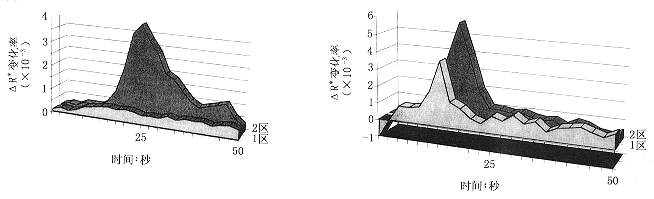 图5 梗死区rrCBV重度下降(10天):1区示梗死区∫△R*为0.015 3;2区示对侧相应区 ∫△R*为0.060 5;比值为0.25。1区MTT为37.14秒,2区为34.02秒。1区rrCBF=4.12×10-4,2区为17.80×10-4;比值为0.232 图6 梗死区rrCBV的恢复(起病后25天):1区示梗死区∫△R*为0.092;2区示对侧相应区∫△R*为0.105;比值为0.876。1区MTT为22秒,2区为22秒。1区rrCBF=4.182×10-3,2区为4.773×10-3;比值为0.876