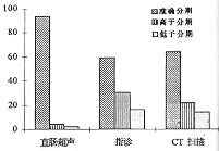图2 直肠超声、 指诊、 CT扫描对直肠癌分期准确性比较