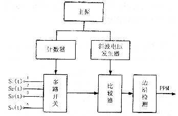 PPM调制器的框图如图3所示,电路通过信号S(t)与锯齿波(斜波信号)比较后产生脉冲宽度调制PDM信号,然后通过单稳态电路取出PDM信号的下降沿(边沿检测)后,形成脉冲位置调制PPM信号。多路信号通过多路开关顺次进入比较器,输出n路信号后再送出一个帧同步信号。该系统的主振频率为2kHz,传送三个生理信号加上一个同步信号,因此系统对信号的采样频率为500Hz.PPM信号的脉冲宽度为1.5μs,信号的平均占空比为0.6%。