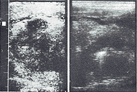 舌癌切除术后声像改变 术后舌声像改变随不同术式而异。仅行过单纯舌部分切除术者,则图像上见切除部分舌回声缺如,舌两侧不对称,形态不规则。若行舌癌切除加肌皮瓣修补术者,则声像图上肌皮瓣横切图呈偏低回声团块,纵切图则见清晰的平行的肌纹理声像(图7);行下颌骨方块切骨术者,声像图上可见骨皮质连续性中断。本组发现2例术后淋巴结转移,其肿大的淋巴结内回声不均,可见不规则无回声区。
