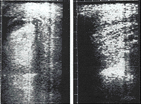 右 旁正中纵切 病灶为低回声区,内见强回声,为溃疡面气体所致