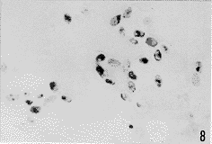 原位杂交结果显示正常静止状态下BMSC、PMφ和SPC胞浆内均有紫蓝色颗粒的IL-6 mRNA的阳性信号。经TSPG诱导后上述细胞IL-6 mRNA表达阳性细胞率和表达强度积分值均明显高于对照组(表5,图4~8),提示TSPG能促进IL-6 mRNA的表达。