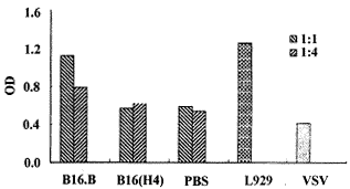 2.2 体外诱生免疫小鼠脾细胞产生细胞因子 融合瘤免疫小鼠脾细胞与亲本瘤细胞共育的MLTC培养上清可检测到明显的IFNγ活性,表现为其上清与L929共育时,能诱导出L929对VSV的抵抗,在样品稀释度为1∶1和1∶4时,OD值为1.12±0.16和0.80±0.08,而亲本B16与PBS免疫组未能测到明显的IFNγ活性,其OD值明显低于前者,P<0.05(图1)。CTLL-2细胞检测IL-2结果也提示两组间存在差异,表现为实验组上清能够更明显地促进CTLL-2细胞的增殖,OD值明显高于B16(H4)免疫组,P<0.01(图2)。WEHI-164是TNF敏感的小鼠纤维肉瘤,MLTC上清中若存在TNF活性则将会导致该细胞的死亡,我们采用Alamar Blue来检测该细胞的增生以反应TNF活性。Alamar Blue是一种植物染料,通常呈蓝色,在细胞增殖时该染料被降解,由蓝色变为粉红色,在570 nm波长可测得OD值升高,反之,细胞死亡越多则此波长时OD值越低。结果表明B16.B免疫组SPL能分泌TNF,即实验组OD值明显低于对照组,P<0.05(图3)。