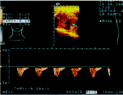 图2 为图1同一瘤体的彩色及频谱图,彩色血流