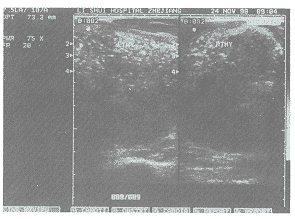 中国超声医学杂志991229 患者,男性,17岁。颈部进行性增大二个月来院诊治。体查:一般情况良好,甲状腺Ⅲ度肿大,表面欠光滑,质中,未触及明显肿块。颈部未触及肿大的淋巴结。心肺(-),腹软,肝脾肋下未触及。实验室检查:血常规正常,T3 T4正常。临床诊断:甲状腺恶性病变可能。