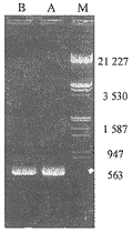 在上述的cDNA中加入5μl 10×PCR缓冲液、引物1和引物2各1μl(150ng/L)、2μl 10mmol/L dNTP、2μl 50mmol/L MgCl2、0.5μl Taq DNA聚合酶(5U/μl),加水至50μl。然后在液面上加3滴石蜡油,放入PCR仪,以94℃45秒,50℃30秒,72℃2分钟为一周期,重复循环35次,最后72℃处理10分钟。扩增完毕后加入3U的DNA聚合酶I Klenow片段进行补齐,0.8%琼脂糖凝胶电泳检查,在约600bp的位置有一条带(图1),回收目的片段。