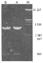M.λ DNA/EcoRⅠ and HindⅢ marker;A.pGC13 digested with Xho Ⅰ and Bstx Ⅰ;B.pGC22 digested with Xho Ⅰ and Bstx Ⅰ.
