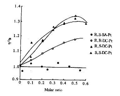 图2为R,R-DC-Pt,R,S-DC-Pt,S,S -DC-Pt及R,S-SA-Pt对 DNA的粘度滴定曲线,显示出3种构型的环斑铂的加入均使DNA的相对粘度明显增加,而环方铂R,S-SA-Pt对DNA的粘度滴定曲线则为一直线,显示了铂络合物与DNA两种完全不同的结合方式。