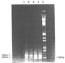 用正常骨髓DNA按10倍比例系列稀释HL60细胞DNA,然后取各稀释度DNA1μg(从纯的HL60细胞DNA1μg,即100起),按前述的条件进行酶切、PCR扩增及结果观察。