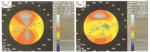 PRK术后1个月的角膜地形图常显示中央区过平,即近视过矫。4~6个月的检查结果表明 ,随 着角膜上皮的增厚和基质的变化,中央区逐渐变陡。对于大多数患者,术后6~8个月屈 光度的退变基本停止,角膜曲率趋于稳定。LASIK术后的角膜地形图则较早达到稳定。